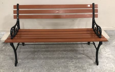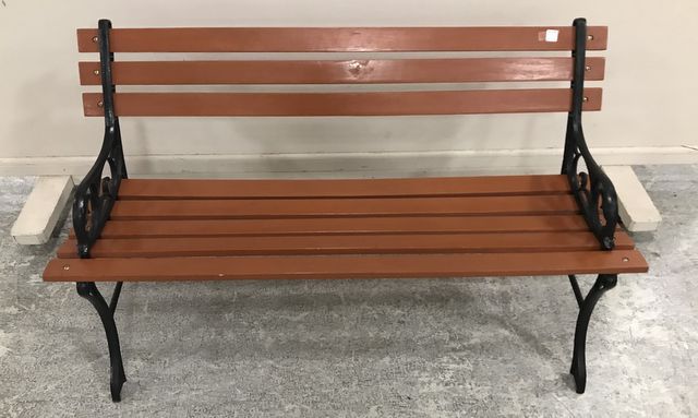 Modern Outdoor/Indoor Sitting Bench, red painted wood with black iron ends, sturdy, good condition, 28"h., 48"w. Modern Outdoor/Indoor Sitting Bench, red painted wood with black iron ends, sturdy, good condition, 28"h., 48"w.