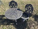 Ornate thin metal chairs and table, weather aged, ornate designs. Ornate thin metal chairs and table, weather aged, ornate designs.