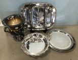 W & S Blackinton Tree of Life Divided tray 18"w., Sheridan Wine cooler urn 11"h., Wallace silver charger golf trophy, monogrammed, W M Rogers serving tray. W & S Blackinton Tree of Life Divided tray 18"w., Sheridan Wine cooler urn 11"h., Wallace silver charger golf trophy, monogrammed, W M Rogers serving tray.