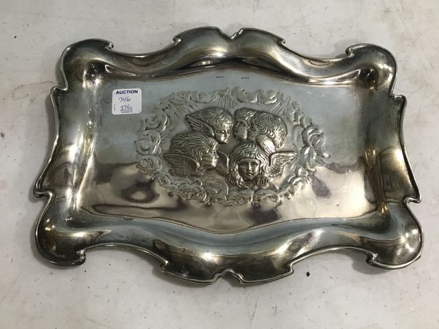 Electroplated Nickel Silver (EPNS) cherub tray, light tarnish, etched and embossed cherub, 11"h., 9"w. Electroplated Nickel Silver (EPNS) cherub tray, light tarnish, etched and embossed cherub, 11"h., 9"w.