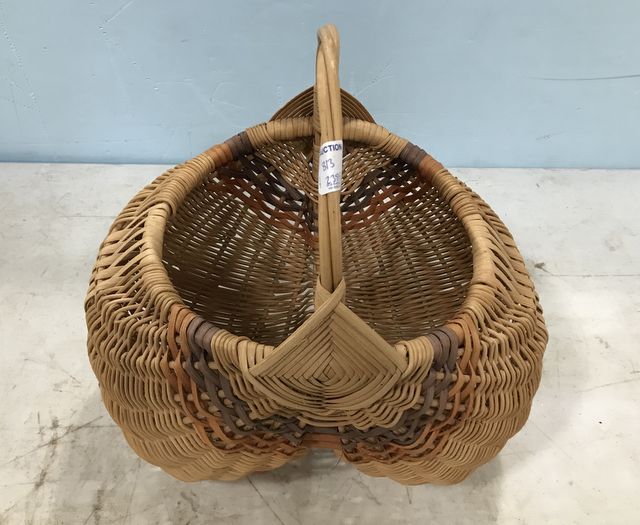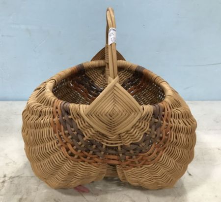 Handled woven buttocks baskets, cross design, painted pattern, good condition, 14"h., 14"w. Handled woven buttocks baskets, cross design, painted pattern, good condition, 14"h., 14"w.