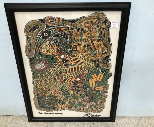 The Serpent Dance Needle Work Churinga, Australia, framed, 21"h., 16"w. The Serpent Dance Needle Work Churinga, Australia, framed, 21"h., 16"w.