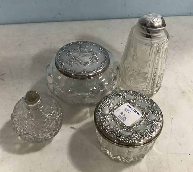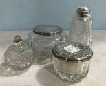 Vanity Glass Container Set, etched flower glass container silver plate top, monogrammed silver plate glass container, pressed glass perfume, silver plated glass powder container. Vanity Glass Container Set, etched flower glass container silver plate top, monogrammed silver plate glass container, pressed glass perfume, silver plated glass powder container.