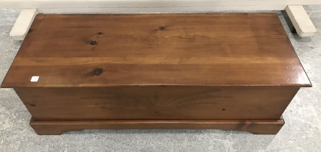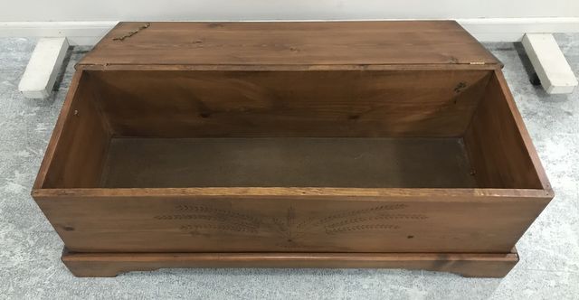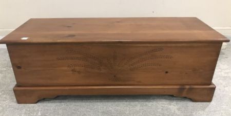 Vintage 1980's Wheat Carved Trunk, lift top, 15"h., 45"w., 17"d. Vintage 1980's Wheat Carved Trunk, lift top, 15"h., 45"w., 17"d.