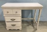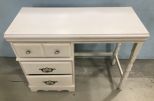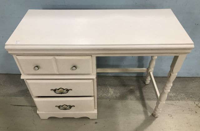White Homestead by Sears Writing Desk, panel board top sides, wood legs and drawers, has some worn spots, 31"h., 40"w., 17"d. White Homestead by Sears Writing Desk, panel board top sides, wood legs and drawers, has some worn spots, 31"h., 40"w., 17"d.