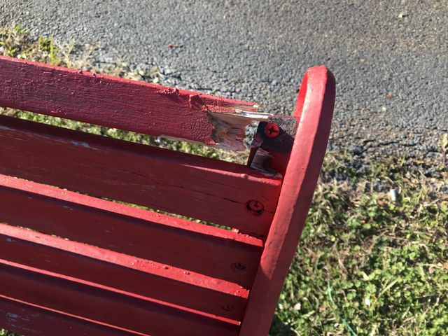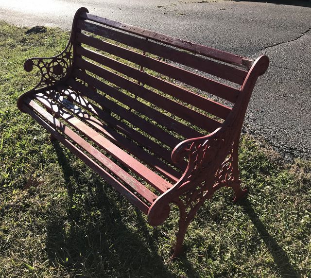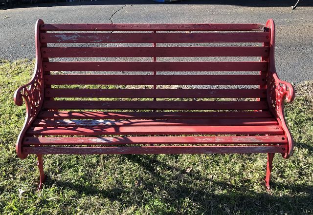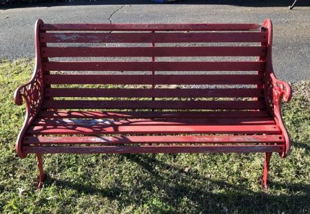 Red Painted Outdoor Iron Bench, red painted iron sides with painted wood frame, right corner wood has damage. Red Painted Outdoor Iron Bench, red painted iron sides with painted wood frame, right corner wood has damage.