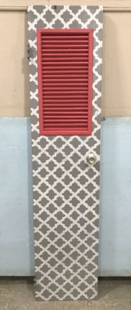 Hand Painted Narrow Side Door, window, knob, and hardware, pink and gray painted, 79"h., 18"w. Hand Painted Narrow Side Door, window, knob, and hardware, pink and gray painted, 79"h., 18"w.