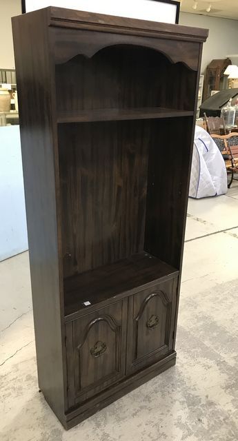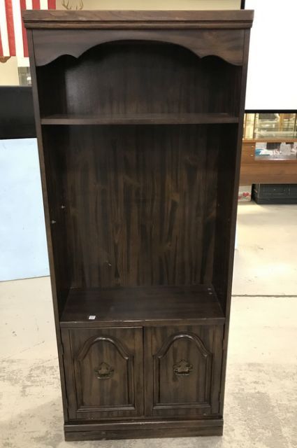 Pressed wood bookshelf, cherry finish, one shelf, double door bottom storage, card board back panel, 72"h., 30"w., 12"d. Pressed wood bookshelf, cherry finish, one shelf, double door bottom storage, card board back panel, 72"h., 30"w., 12"d.