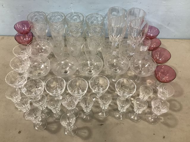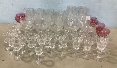 Etched wine glasses, pink stemware, small clear glass goblets, pressed glass water goblets, etched glass sherbets. Etched wine glasses, pink stemware, small clear glass goblets, pressed glass water goblets, etched glass sherbets.