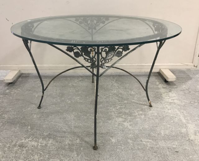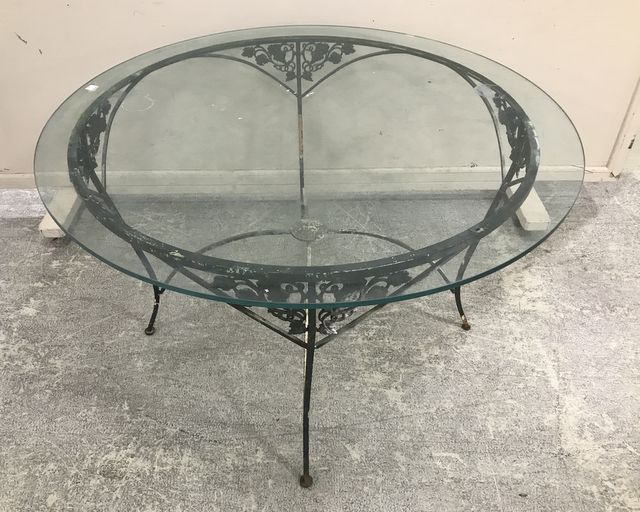 Outdoor Metal Base Glass Patio Table, glass top needs cleaning, base is aged and worn areas, 29"h., 48"dia. Outdoor Metal Base Glass Patio Table, glass top needs cleaning, base is aged and worn areas, 29"h., 48"dia.