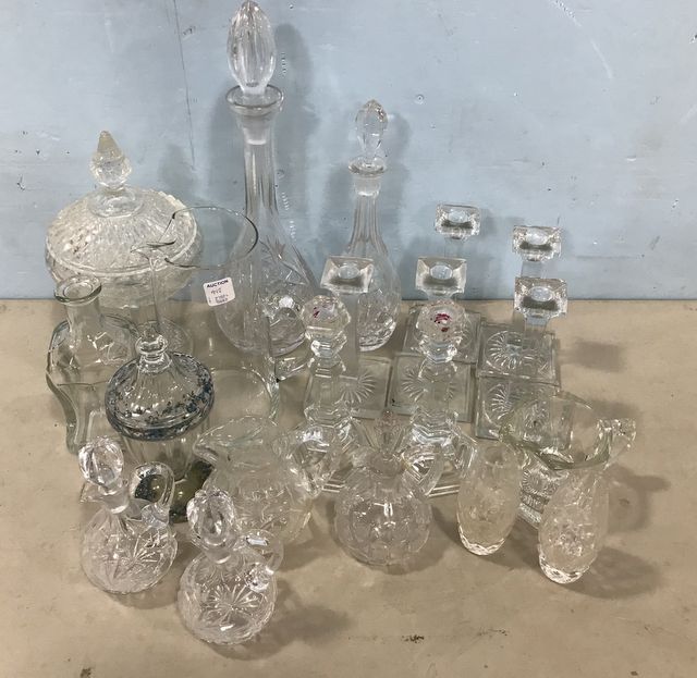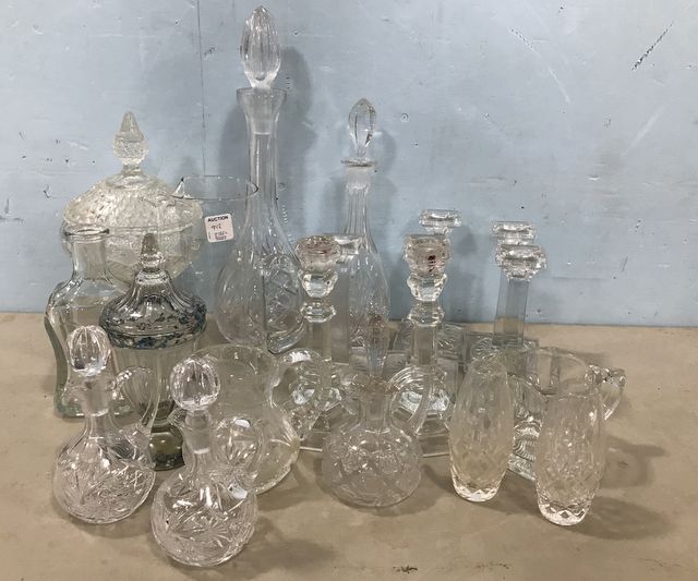 Two clear glass decanters, diamond pattern candy compote, clear glass painted jar, glass pitcher, olive jars, candle holders, vases, pitchers. Two clear glass decanters, diamond pattern candy compote, clear glass painted jar, glass pitcher, olive jars, candle holders, vases, pitchers.
