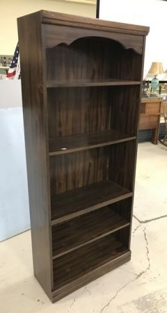 Pressed wood bookshelf, four shelves, cherry finish, cardboard back panel, 72"h., 30"w., 12"d. Pressed wood bookshelf, four shelves, cherry finish, cardboard back panel, 72"h., 30"w., 12"d.