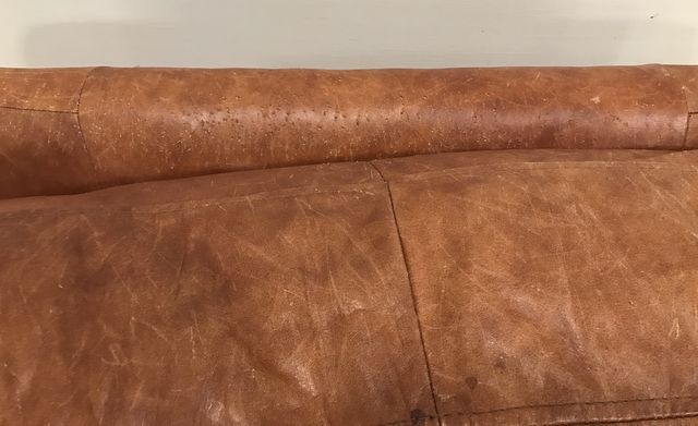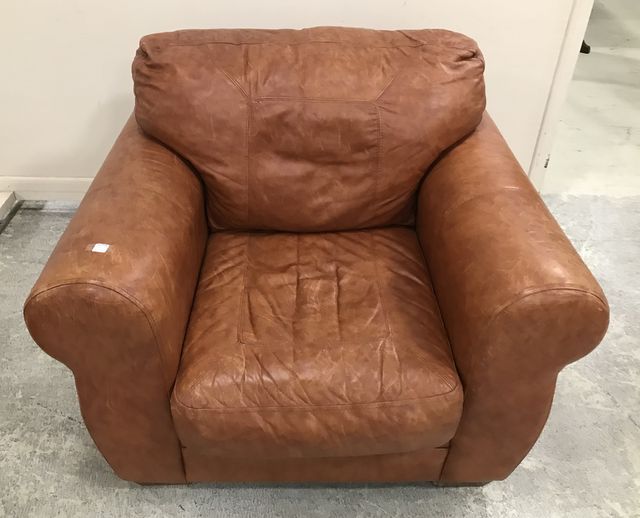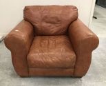 Sealy Furniture Faux Leather Arm Chair, has age and usage wear, animal claw mark on back, 32"h. Sealy Furniture Faux Leather Arm Chair, has age and usage wear, animal claw mark on back, 32"h.