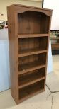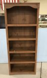 Pressed wood bookshelf, display shelves, cardboard back panel, pine wood finish, 72"h., 30"w. Pressed wood bookshelf, display shelves, cardboard back panel, pine wood finish, 72"h., 30"w.