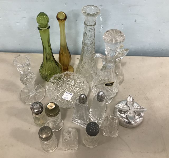 Amber glass jars, glass candle holder, olive jar, salt & pepper, pressed glass dish, crystal decanter. Amber glass jars, glass candle holder, olive jar, salt & pepper, pressed glass dish, crystal decanter.