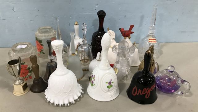 Oregon bell, crystal bells, Norman Rockwell, 50 anniversary, milk glass bell, Geobel angel bell, gold painted lady, ceramic unicorn bell, frosted glass, silver plate bell, small wood handle bell, cardinal bird bell. Oregon bell, crystal bells, Norman Rockwell, 50 anniversary, milk glass bell, Geobel angel bell, gold painted lady, ceramic unicorn bell, frosted glass, silver plate bell, small wood handle bell, cardinal bird bell.