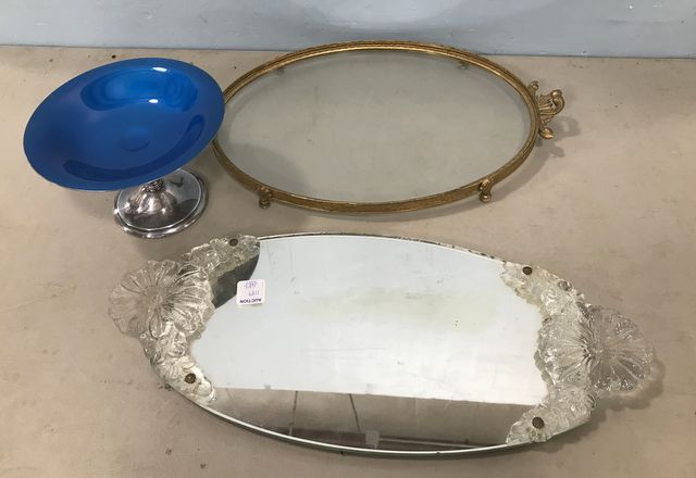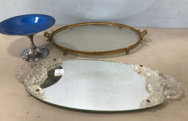 Gold tone footed vanity glass tray 16"w., oval glass handled mirror vanity tray, and blue painted silver plate compote. Gold tone footed vanity glass tray 16"w., oval glass handled mirror vanity tray, and blue painted silver plate compote.