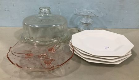 1198 Glass Cake Stand, Pink Depression Footed Dish and Ironstone Plates