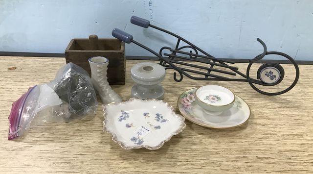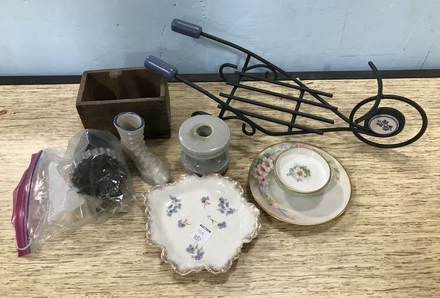 Hand painted porcelain dishes, ceramic shoe, wood mold press, metal wagon stand, tin cookie molds. Hand painted porcelain dishes, ceramic shoe, wood mold press, metal wagon stand, tin cookie molds.