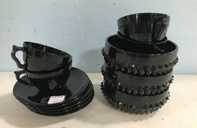 Black Amethyst 3 bowls, saucers, 4 cups. Black Amethyst 3 bowls, saucers, 4 cups.