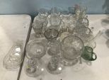 Glass cups, creamer, sugar, pear dish, flower vase, art glass compote, candle holders, salts, round dish. Glass cups, creamer, sugar, pear dish, flower vase, art glass compote, candle holders, salts, round dish.