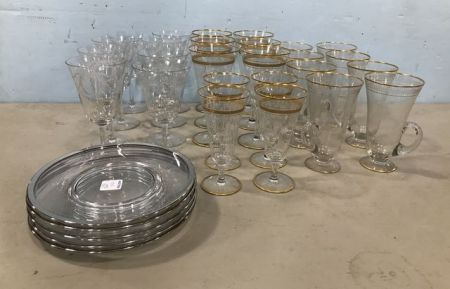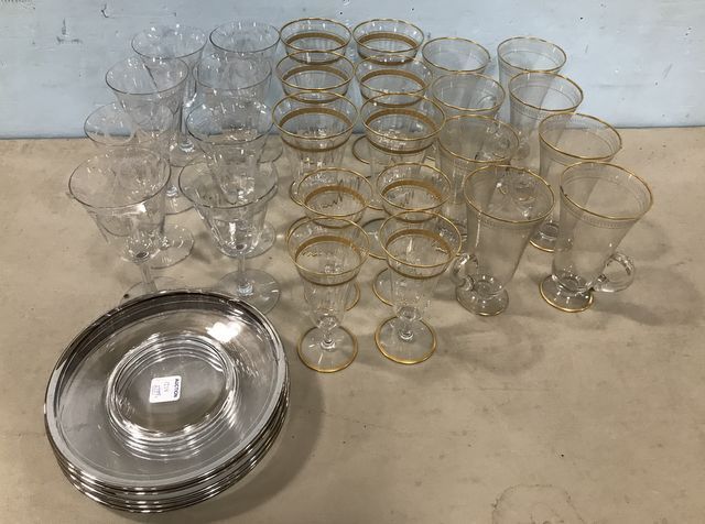 Gold rim goblets and cups (several with rim chips), wreath etched stemware, silver plate rim plates. Gold rim goblets and cups (several with rim chips), wreath etched stemware, silver plate rim plates.