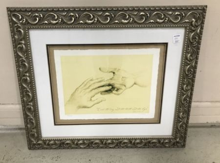 Framed Hand Print by D.Wells, numbered 44/200, pencil signed, artist proof, framed 21"h., 25"w. Framed Hand Print by D.Wells, numbered 44/200, pencil signed, artist proof, framed 21"h., 25"w.