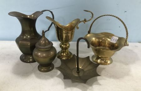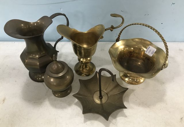 Brass compote, urn, pitcher, umbrella decor, vase. Brass compote, urn, pitcher, umbrella decor, vase.