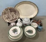 Large porcelain platter, collectible plate, Spode Christmas Tree partial china, pitcher, blue oil lamp, hobnail milk glass perfume, sugar, Oriental style dish. Large porcelain platter, collectible plate, Spode Christmas Tree partial china, pitcher, blue oil lamp, hobnail milk glass perfume, sugar, Oriental style dish.