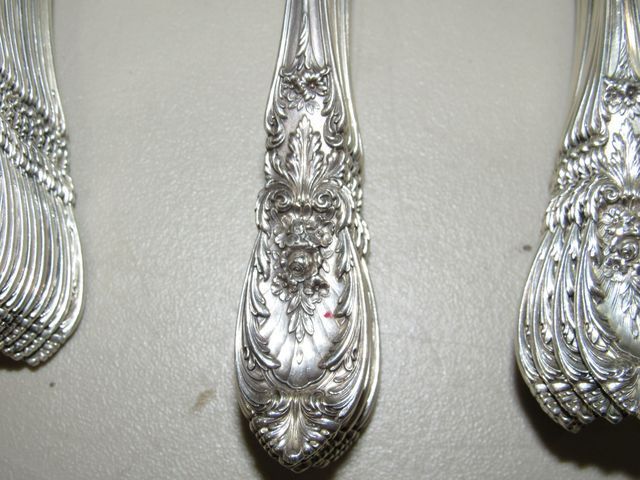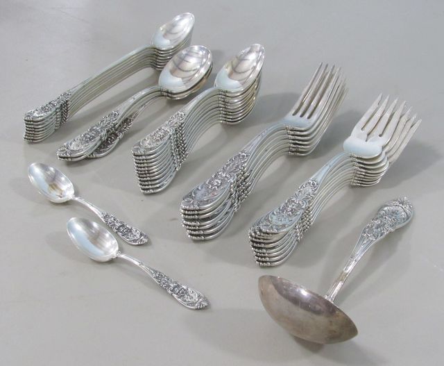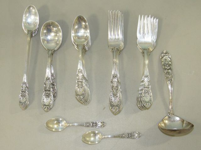 8 tea spoons, 11 place spoons, 7 place forks, 3 soup spoons, 9 salad forks, 2 demitasse, ladle, one knife, 42 total pieces, 55.605 ozt. 8 tea spoons, 11 place spoons, 7 place forks, 3 soup spoons, 9 salad forks, 2 demitasse, ladle, one knife, 42 total pieces, 55.605 ozt.