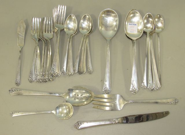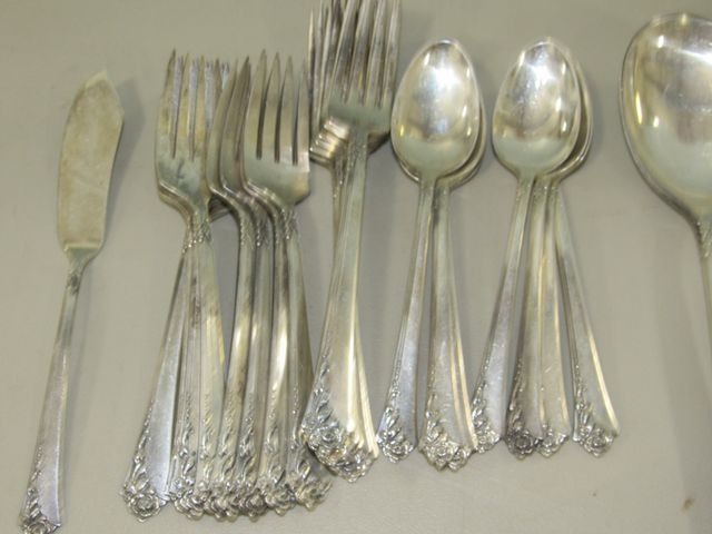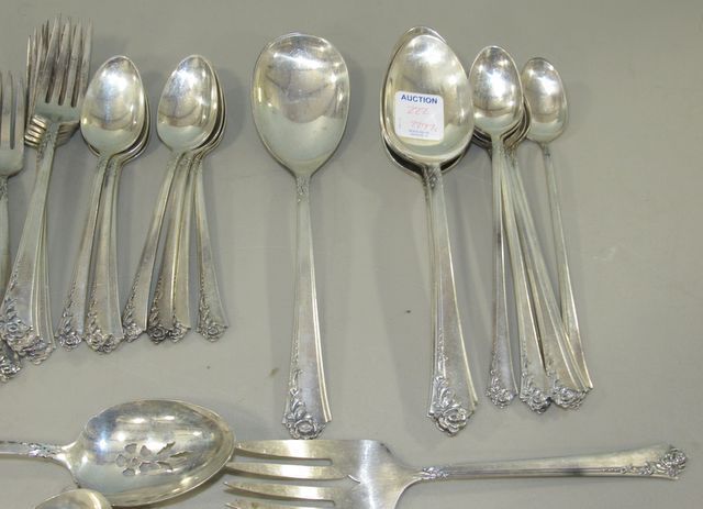 6 serving spoons, 8 ice tea spoons, 8 salad forks, 6 place forks, 8 place spoons, serving fork, butter knife, one knife, soup spoon, 40 total pieces, 51.785 ozt. 6 serving spoons, 8 ice tea spoons, 8 salad forks, 6 place forks, 8 place spoons, serving fork, butter knife, one knife, soup spoon, 40 total pieces, 51.785 ozt.