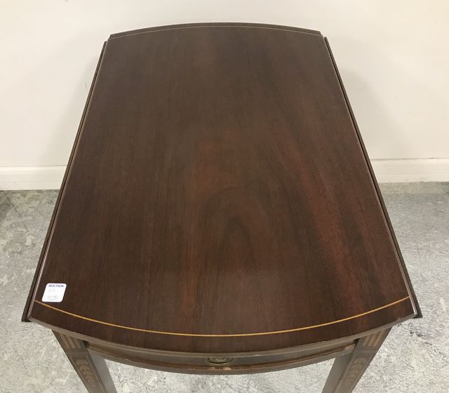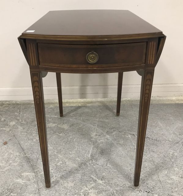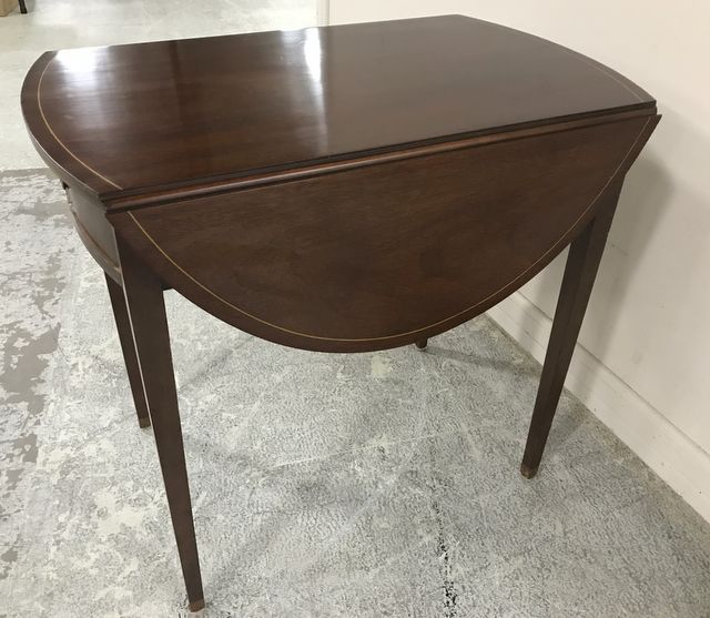 Mahogany Sheraton style drop leaf Pembroke end table, single drawer, vintage, has light finish swirls and scratches on top, 28"h., 30"d., 18"d. Mahogany Sheraton style drop leaf Pembroke end table, single drawer, vintage, has light finish swirls and scratches on top, 28"h., 30"d., 18"d.
