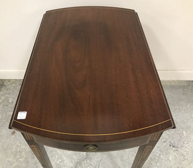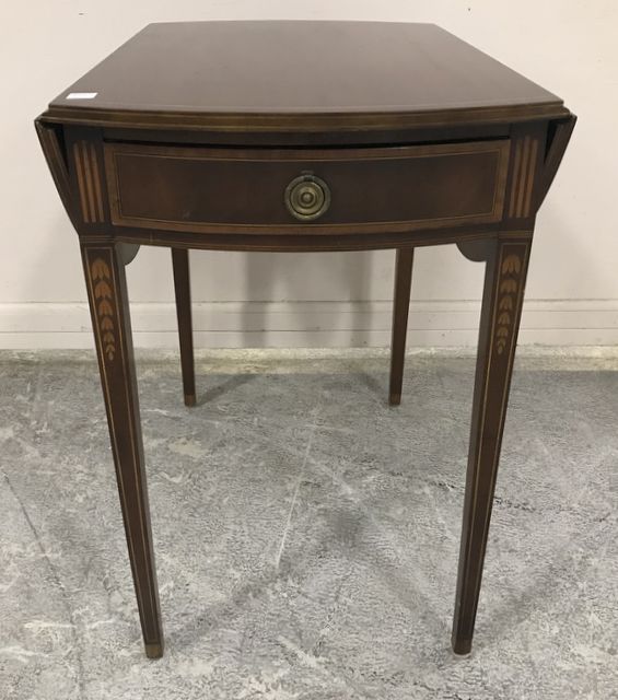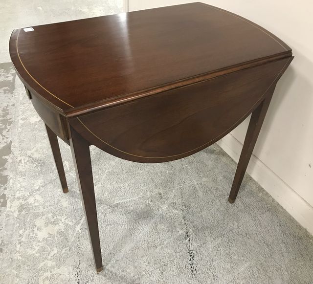 Mahogany Sheraton style drop leaf Pembroke end table, single drawer, vintage, has light finish swirls and scratches on top, 28"h., 30"d., 18"d. Mahogany Sheraton style drop leaf Pembroke end table, single drawer, vintage, has light finish swirls and scratches on top, 28"h., 30"d., 18"d.