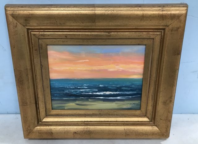 Oil painting on board "Destin Sunset" by Patricia Stodghill 2004, Mississippi Artist. Framed 17"h., 20"w. Oil painting on board "Destin Sunset" by Patricia Stodghill 2004, Mississippi Artist. Framed 17"h., 20"w.