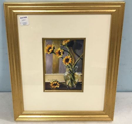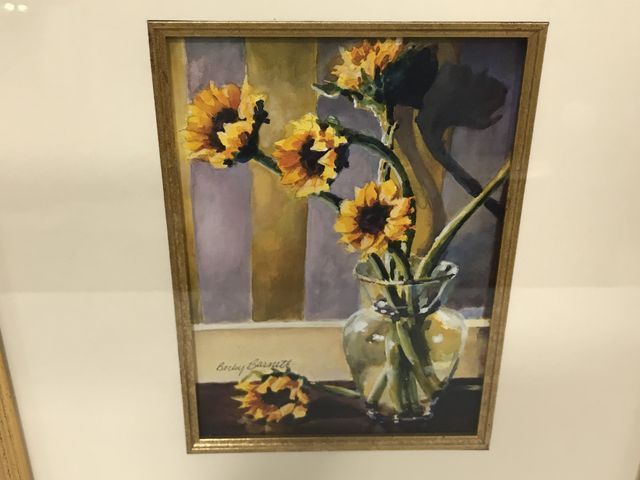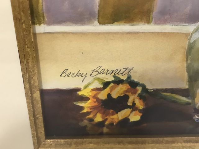 Watercolor of sunflowers, framed 15"h., 13"w., signed Becky Barnett. Mississippi Artist. Watercolor of sunflowers, framed 15"h., 13"w., signed Becky Barnett. Mississippi Artist.