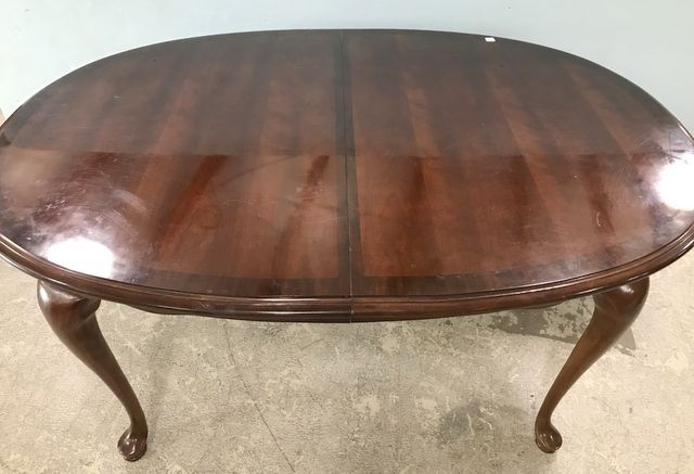 Broyhill queen anne style oval dining table, one leaf, has some whirl marks on top, 29"h., 62"w., 43"d. Broyhill queen anne style oval dining table, one leaf, has some whirl marks on top, 29"h., 62"w., 43"d.