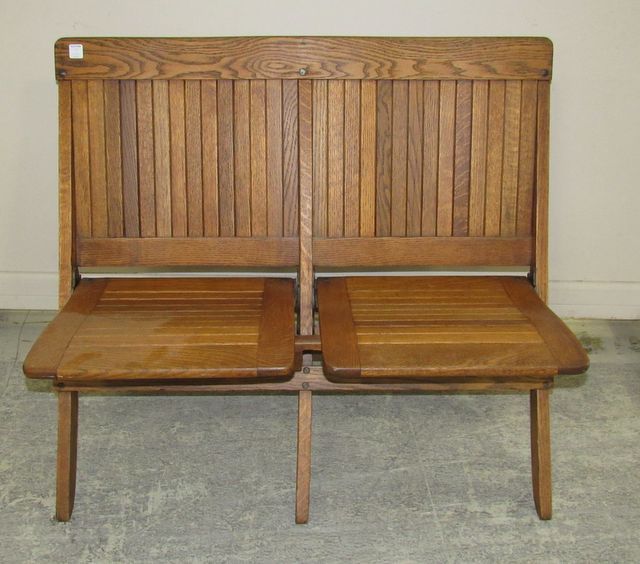 Oak double seat bench, seats fold up, good condition, 30"h., 37"w. Oak double seat bench, seats fold up, good condition, 30"h., 37"w.