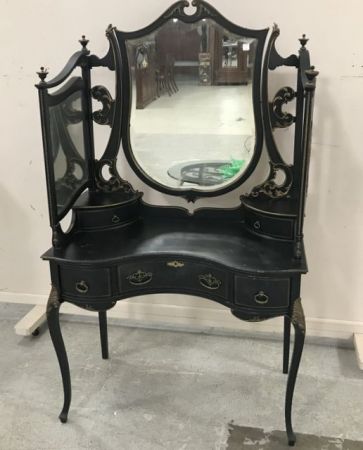 Vintage, French style, painted black with gold trim work, shield shape center mirror with two fold out side mirrors, five drawers, ornate, has wear, needs some work, 66"h., 38"w., 20"d. Vintage, French style, painted black with gold trim work, shield shape center mirror with two fold out side mirrors, five drawers, ornate, has wear, needs some work, 66"h., 38"w., 20"d.