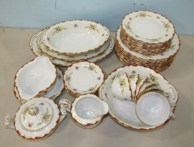 Fine china, Japan, 8 dinner plates, 8 saucers, 7 cups, 8 salad plates, creamer, gravy boat, sugar, 3 platters, bowl. Fine china, Japan, 8 dinner plates, 8 saucers, 7 cups, 8 salad plates, creamer, gravy boat, sugar, 3 platters, bowl.
