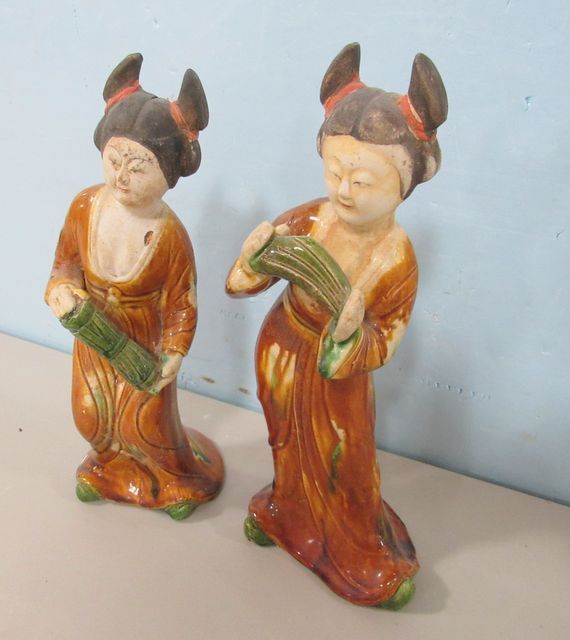 Pottery Tang style glazed pottery of women, has wear and some small chips, 11"h. Pottery Tang style glazed pottery of women, has wear and some small chips, 11"h.