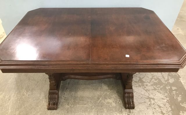 Walnut depression era dining table with leaf and pads, removable top with wing nuts, ornate carved base, has veneer missing spot on top, 31"h., 61"L., 43"w. Walnut depression era dining table with leaf and pads, removable top with wing nuts, ornate carved base, has veneer missing spot on top, 31"h., 61"L., 43"w.
