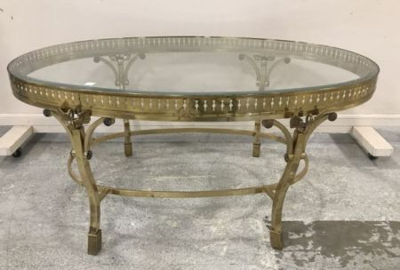 Brass frame with swan emblems, beveled top glass, 22"h., 50"w., 33"d. Brass frame with swan emblems, beveled top glass, 22"h., 50"w., 33"d.