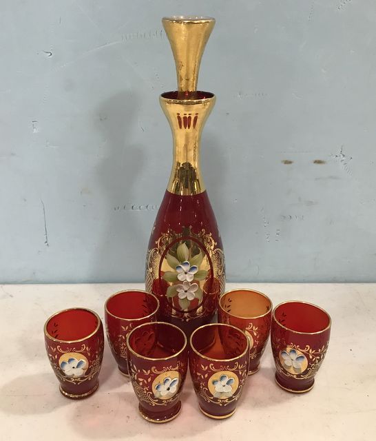 Hand painted gold gilt with flowers decanter 11"h., and six shot glasses. Hand painted gold gilt with flowers decanter 11"h., and six shot glasses.