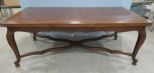 Parquet top, extendable leaves, stretcher, carved legs and base. some blemishes, veneer splits in spots, 30"h., 82"w. Parquet top, extendable leaves, stretcher, carved legs and base. some blemishes, veneer splits in spots, 30"h., 82"w.