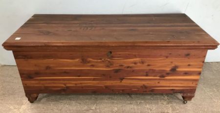 Lift top cedar trunk, 21"h., 48"w., 21"d., on wheels. Lift top cedar trunk, 21"h., 48"w., 21"d., on wheels.