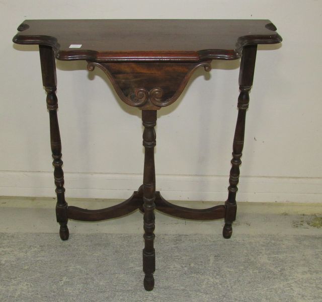 Vintage mahogany demi lune wall console stand, three leg with stretcher, has minor scratches on top, 29"h., 28"w., 13"d. Vintage mahogany demi lune wall console stand, three leg with stretcher, has minor scratches on top, 29"h., 28"w., 13"d.