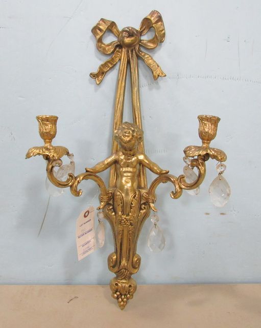 Gold tone two arm figural candelabra wall sconce with bow tie and glass prisms (missing some prisms) 22"h. Gold tone two arm figural candelabra wall sconce with bow tie and glass prisms (missing some prisms) 22"h.