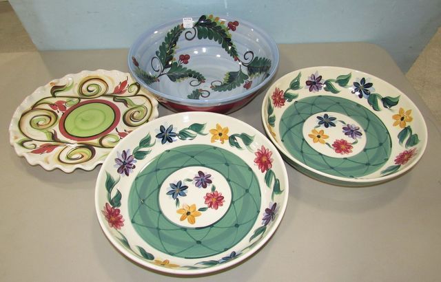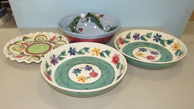 Gail Pittman 2006 Christmas bowl 4"h., 14"dia., Gail Pittman 2000 platter 13"dia., Gail Pittman 1993 serving bowl 3"h., 13"dia. Gail Pittman 2006 Christmas bowl 4"h., 14"dia., Gail Pittman 2000 platter 13"dia., Gail Pittman 1993 serving bowl 3"h., 13"dia.