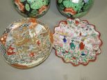 Pair of Modern hand painted porcelain ginger jars 8"h., Japanese hand painted with Geisha scenery plate 10"dia., Satsuma style hand painted plate with warrior scenery, gold embossed, 10"dia. Pair of Modern hand painted porcelain ginger jars 8"h., Japanese hand painted with Geisha scenery plate 10"dia., Satsuma style hand painted plate with warrior scenery, gold embossed, 10"dia.