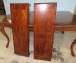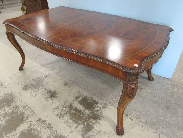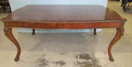 Burl wood design, ornate machine carved border and trim, inlaid trim top, two leaves, legs are removable, 30"h. 75"w., 36"d. Burl wood design, ornate machine carved border and trim, inlaid trim top, two leaves, legs are removable, 30"h. 75"w., 36"d.